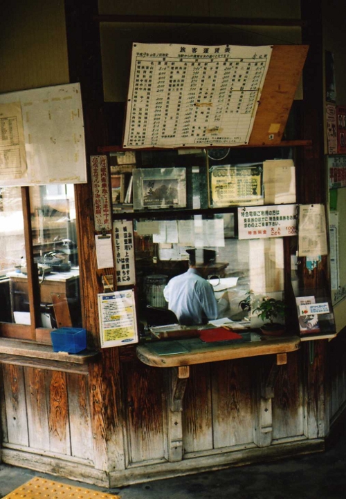 映り込みと駅員の背中、駅の窓口の感じが たまりません。