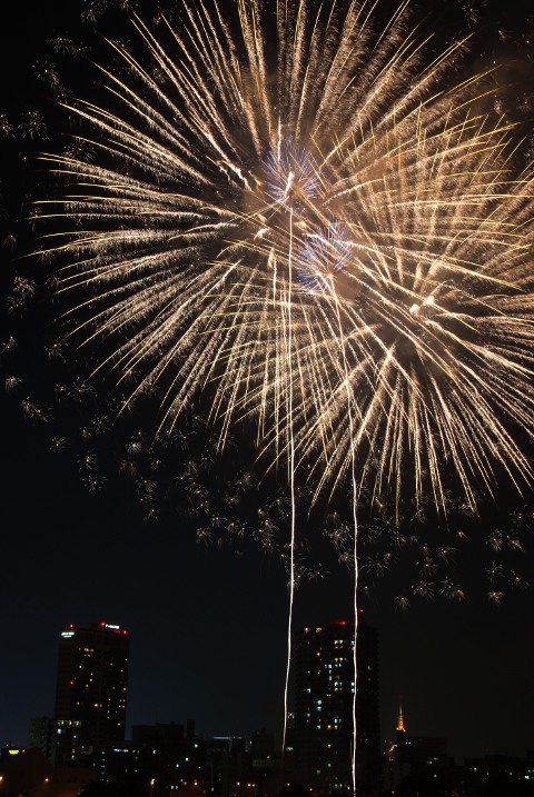私も行ってまいりました!初めて、打ち上げ場所の前のほうで観ることができたのですが、迫力が全然違いますね。撮るのは・・・ダメでしたが、観るには最高でした~♪先生が撮られた花火は 街の中だとすぐわかるように ビルが入っていて 高さや位置の比較ができますね。また感動が甦ります!!