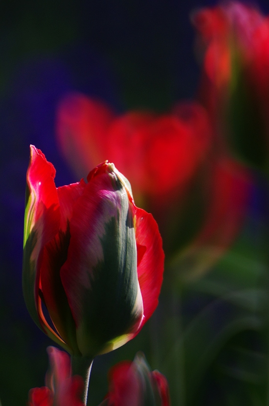 私も燃えているようだなと思いました~ラストの葉っぱのボケがなんとも不思議な感じですね。背景の濃いブルーもお花を引き立てていますね。