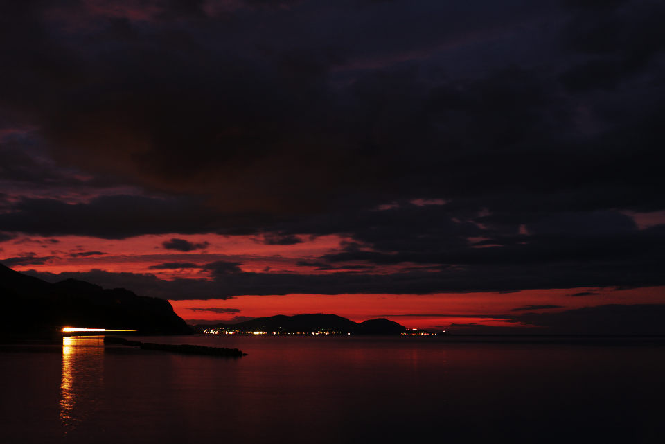 汽笛だけが聞こえる海岸。波音はない。そんな一日の終わり。